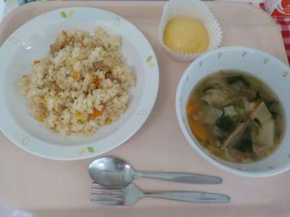 本日の給食は、ガーリックチャーハン・ワンタンスープ・マーラーカオ・牛乳です。