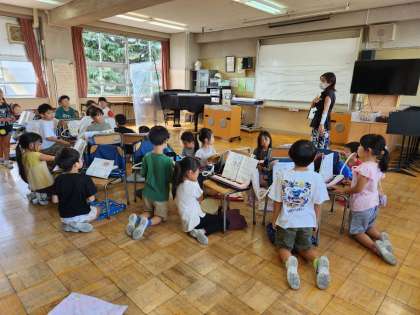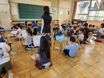鍵盤ハーモニカ、タンブリン、カスタネットで合奏の学習をしています。