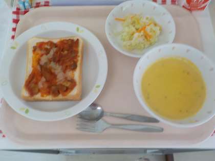 本日の給食は、ピザトースト・キャロットポタージュ・コールスロー・牛乳です。