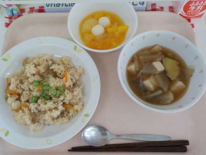 本日の給食は、五目ごはん・田舎汁・お月見フルーツポンチ・牛乳です。