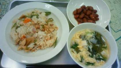 4月17日、今日は、季節を感じる献立です。 たけのこごはん 牛乳 かきたま汁 煮豆です。春の香りがします。