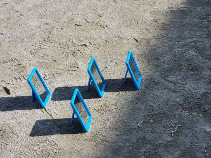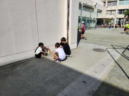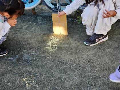 太陽の光と鏡を使った実験、観察を行っています。グループで協力しながら太陽の光を温度計に当てて、温度の変化をしらべています。