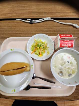 今日の給食は、イチゴジャムパンとクリームスープです。