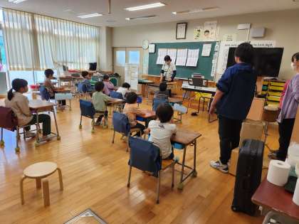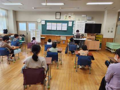 「にじ」の歌を学習しています。お話を落ち着いて聞いて、「にじ」の歌を歌っています。