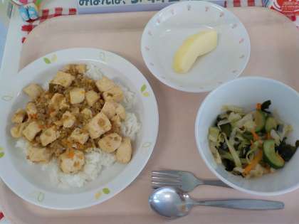 本日の給食は、マーボー豆腐丼・海藻サラダ・りんご・牛乳です。