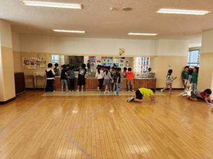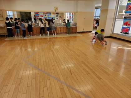 1、2年生が、雑巾を洗っています。2年生は、床拭きが上手です。