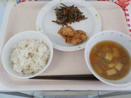 本日の給食は、麦ごはん・鶏肉のから揚げ・かみかみきんぴら・味噌汁・牛乳です。