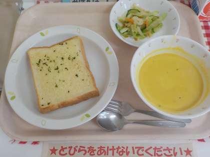 本日の給食は、ガーリックトースト・パンプキンポタージュ・玉ねぎドレッシングサラダ・牛乳です。