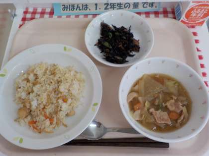本日の給食は、こぎつねごはん・具だくさんひじき煮・豚汁・牛乳です。