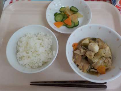 本日の給食は、ごはん・すきやき煮・シャキシャキ野菜・牛乳です。