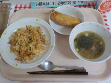 本日の給食は、キムチチャーハン・春巻き・わかめスープ・牛乳です。