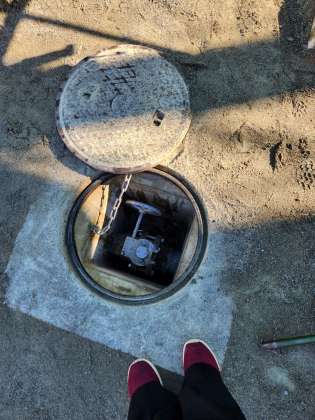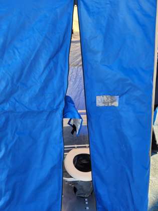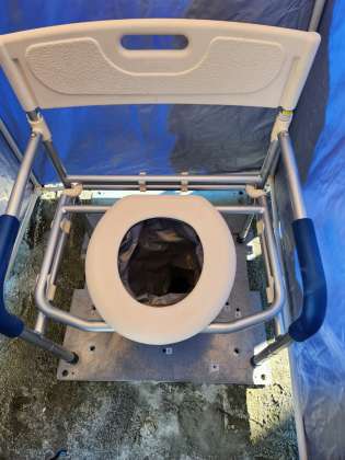 簡易トイレの設置です。校庭内にある井戸水を利用して、汚物を流すそうです。
