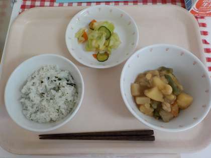 本日の給食は、わかめごはん・豆入り筑前煮・やさいのしょうが醤油がけ・牛乳です。