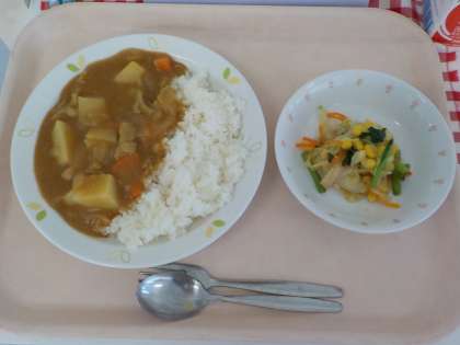 本日の給食は、三宿カレーライス・こまつなサラダ・牛乳です。