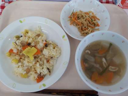 本日の給食は、吹き寄せおこわ・ごま酢がけ・のっぺい汁・牛乳です。