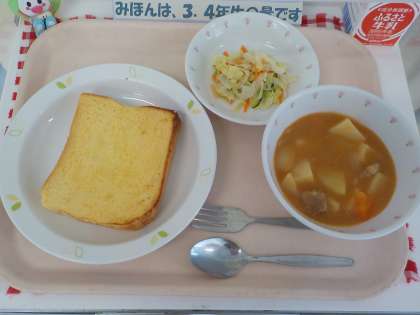 本日の給食は、フレンチトースト・ポークシチュー・りんごドレッシングサラダ・牛乳です。