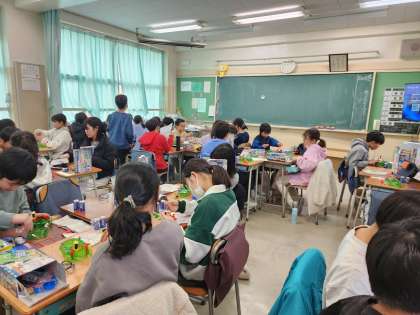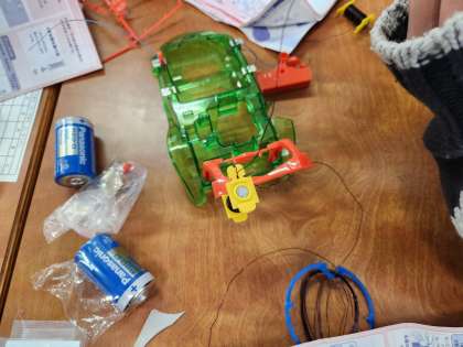 説明書をよみながら、電磁石を使った実験セットを組み立てています。