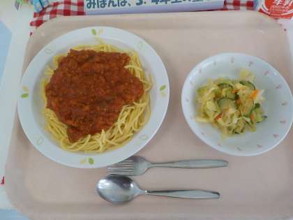 本日の給食は、スパゲッティミートソース・イタリアンサラダ・牛乳です。