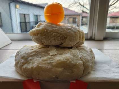PTA 主催のもちつき大会で、杵と臼でついた餅で鏡餅を作っていただきました。