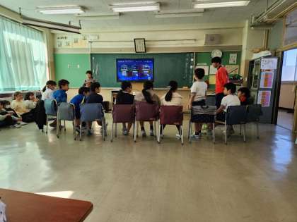 5年生が、総合的な学習の時間に学習した「米」について、パワーポイントにまとめました。まとめたものを4年生に発表しました。