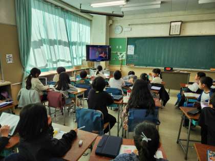 自分が作った作品の写真をタブレットで撮ります。その作品に英語で話して紹介する声を録音します。