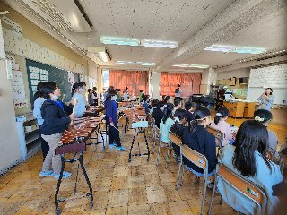 最後は、学年で合奏しました。リコーダーの音色がきれいで、大太鼓、小太鼓、鉄琴、木琴、バスマスターの音色がピッタット合ったすてきな合奏でした。