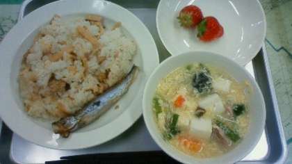 今日は、中華おこわ 牛乳焼きししゃも にらたまスープ くだもの(いちご) です。