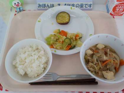 本日の給食は、有機米ごはん・すき焼き煮・野菜のレモンじょうゆかけ・ふかし芋・牛乳です。