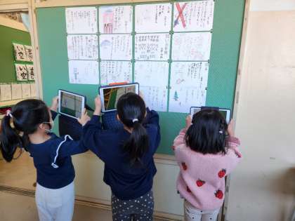 教室に戻り、ロイロノートに提出して、学級内で共有していきます。タブレットの扱い方を少しずつ身に付けています。