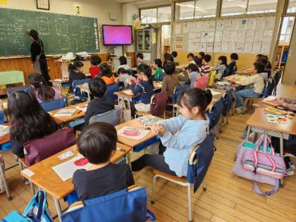三宿小学校は、1年生から図工は、図工専門の図工専科教員が担当しています。今日は、節分に向けて、鬼のかおを描いています。