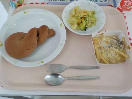 本日の給食は、ココアパン・グラタン・りんごドレッシングサラダ・牛乳です。