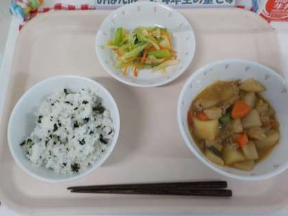 本日の給食は、わかめごはん・肉じゃがうまに・やさいのうまみあえ・牛乳です。