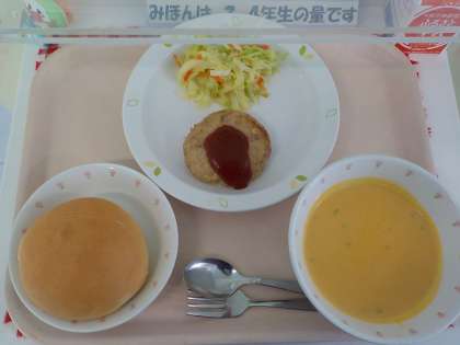 本日の給食は、丸パン・ハンバーグ・コールスロー・キャロットポタージュ・牛乳です。