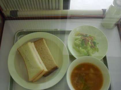 今日は、かみかみ給食の日です。献立は、二色サンド、牛乳、ミネストローネ、ごぼうチップサラダです。朝の児童集会でも保健給食委員会がかむことの効果について、わかりやすく発表してくれました。