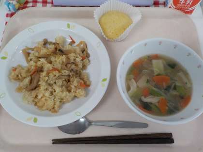 本日の給食は、中華おこわ・ワンタンスープ・マーラーカオ・牛乳です。