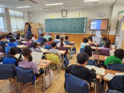 子どもたちは、集中して聞き。文章を目で追うことができています。