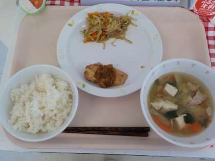 本日の給食は、有機米ごはん・鶏肉の南蛮焼き・野菜ソテー・豆腐汁・牛乳です。