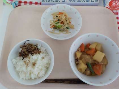 本日の給食は、ごはん・かみかみ佃煮・筑前煮・小松菜のあえもの・牛乳です。
