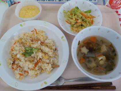 本日の給食は、ちらしずし・やさいのからしじょうゆ・すまし汁・桃のヨーグルトケーキ・牛乳です。