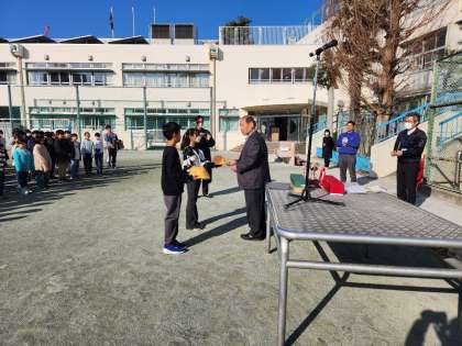 新一年生の黄色い帽子を地域の皆さんから贈呈していただきました。