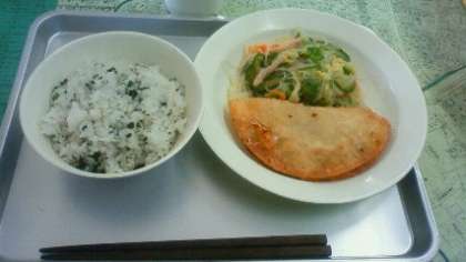 今日は わかめごはん、牛乳、ジャンボぎょうざ 春雨サラダ です。人気献立のひとつです。