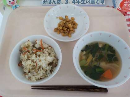 本日の給食は、豚肉とごぼうのごはん・大豆とじゃこの甘辛揚げ・吉野汁・牛乳です。