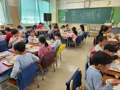 今日から2年生から6年生は、給食が始まりました。2年生の子どもたちは、上手に配膳ができて早く食べ始められました。
