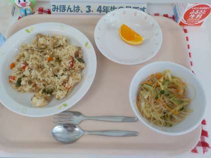 今年度最初の給食は、ガパオ風ライス・春雨サラダ・清見オレンジ・牛乳です。