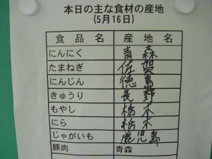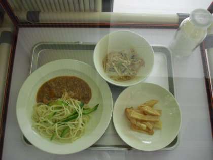 ジャージャー麺、牛乳、もやしのごま和え、フライドポテトです。今日は快晴で、子どもたちは校庭で一生懸命運動会の練習に取り組んでいました。