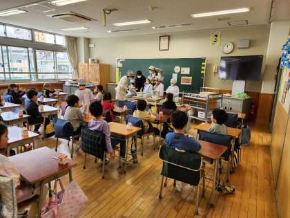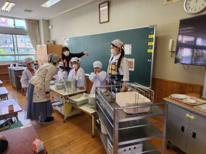 各クラス、担任のほかに二人の補助を付けを付けて配膳の指導をおこなっています。