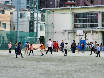 多くの教員も校庭に出ています。子どもに負けないように走りますが、声をかけられて立ち止まったところをタッチされる教員の姿もあります。