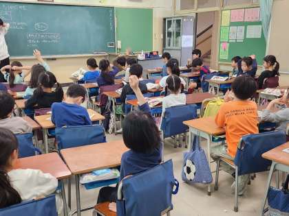生活科の学習をしています。みんな、手を上げて自分の考えを発表しています。