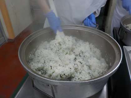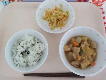 本日の給食は、わかめごはん・肉じゃがうまに・やさいのおかかあえ・牛乳です。