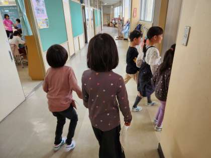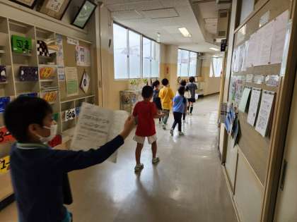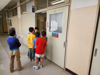 2年生が1年生をサポートして、学校内を案内して、教室の前でどんな部屋なのかを説明しています。
